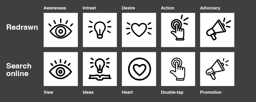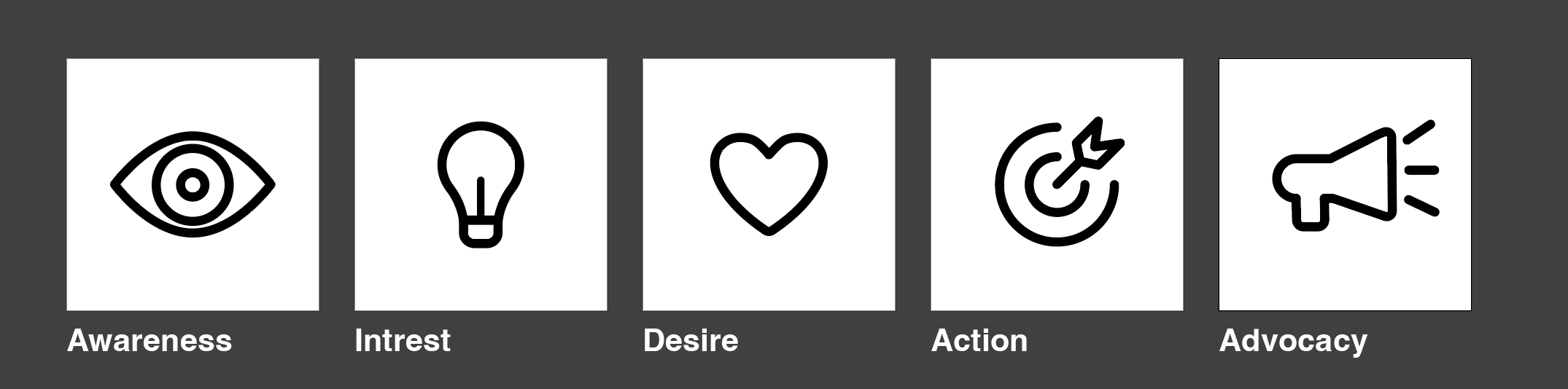 - awareness > 2. interest > 3. desire > 4. action > 5. advocacy