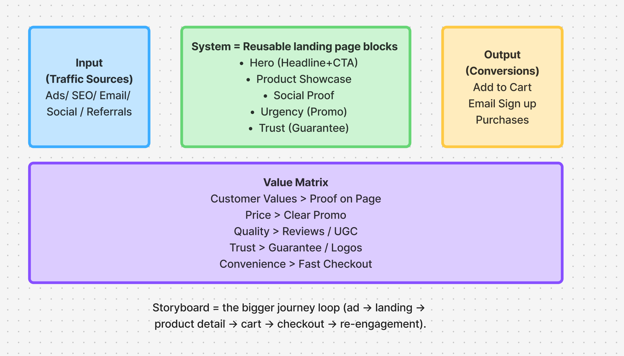 This is the real future of landing page design in e-commerce: not isolated visuals, but storyboards, value matrices, and digital twins — a system we can learn from, improve, and scale.